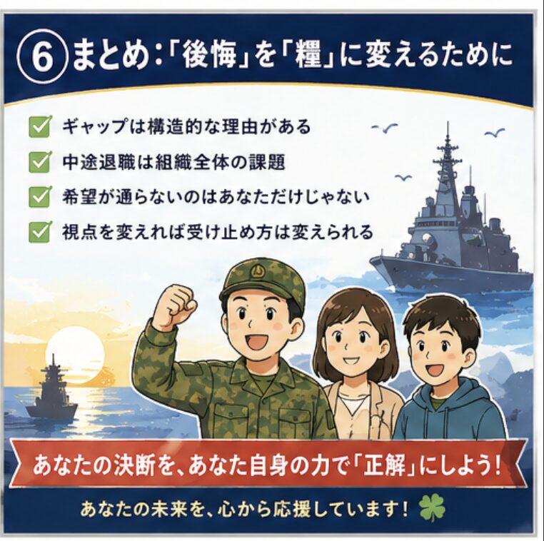 数年後の職種転換、部内公募、あるいは自衛隊での経験を活かした民間への転職など、選択肢は時間とともに広がります。