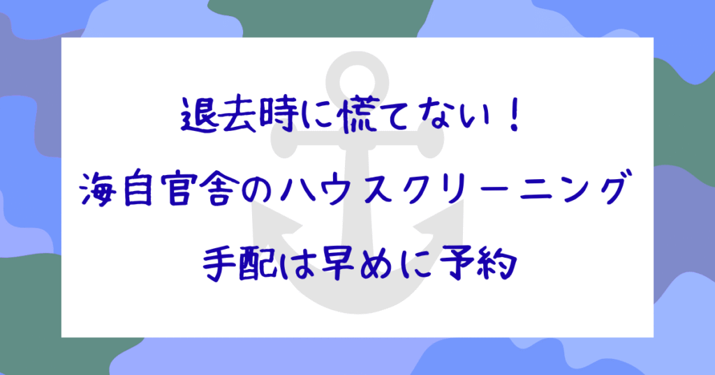 海自官舎を退去する際、必須となるのがハウスクリーニング。すぐに見つかるだろうと後回しにしていると業者が見つからなかったり、直前に慌てて手配すると高額になったりすることも考えられます。引っ越しの手配と合わせて早めに見積もりと予約を行いましょう!